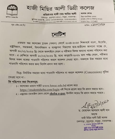 অনার্স কোর্সে ২০২৪-২০২৫ শিক্ষাবর্ষে অনলাইনে বেতন পরিশোধ করার নোটিশ: Download Redmore